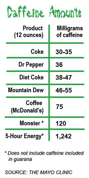 Up to 400 mg of caffeine a day is considered to be safe for most healthy adults. That is the amount of caffeine you would find in four cups of coffee. Adolescent’s ages 12 to 18 intake of caffeine should be 100 mg per day. That is equivalent to one cup of coffee or two cans of pop. The amount of caffeine found in a 24oz energy drink is 276 mg. The popular Starbucks Doubleshot Energy Coffee in a can has 145 mg of caffeine.
